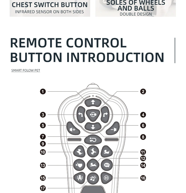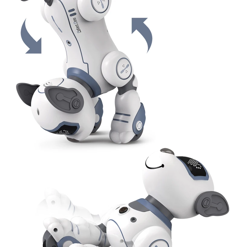 Say hello, sit down, and please perform stunts,Handstand rotation and flip action,Push-up exercises,Cute stunts,Smart touch sensor interactive funny dog mode,Intelligent marching follow,Simulate a smooth and changeable stunt music and dance combination.
